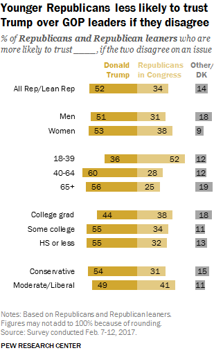 Il y a cependant une exception intéressante. Si on ne tient compte que des réponses des Républicains âgés de moins de 40 ans, la tendance s’inverse. 52% d’entre eux déclarent qu’ils feraient davantage confiance aux Républicains du Congrès qu’à Donald Trump en cas d’affrontement. 36% déclarent qu’ils feraient davantage confiance au président.