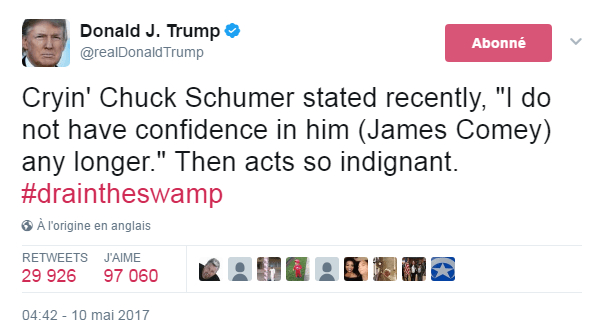 Face à la tempête politico-médiatique déclenchée par sa décision de renvoyer Comey, Donald Trump a réagi comme à son habitude sur Twitter. Sa première réaction a été de s’en prendre à Chuck Schumer et aux autres Démocrates, qu’il accuse d’être des hypocrites. Il rappelle que les Démocrates n’ont cessé de critiquer James Comey pour sa gestion de l’affaire Clinton. D’après lui, ils ne devraient donc pas se plaindre de son licenciement. (NB: Il est vrai qu’Hillary Clinton, son équipe de campagne, et beaucoup d’élus démocrates affirment régulièrement que l’annonce de la réouverture de l’enquête sur les e-mails de la candidate démocrate quelques jours avant l’élection lui a coûté la victoire).